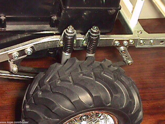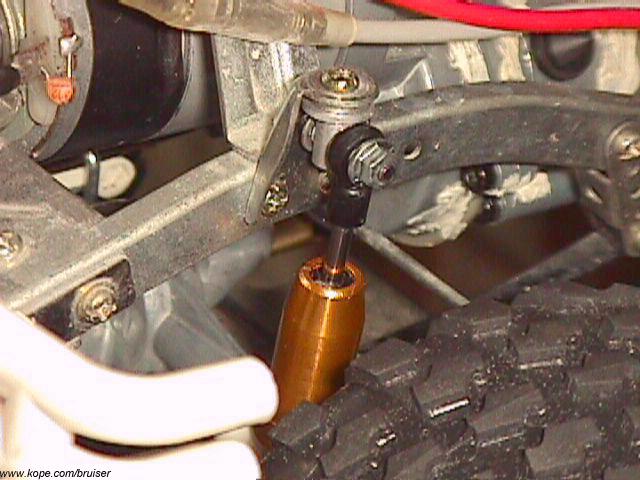You can mount up to 4 shocks on the rear end of your Bruiser/Mountaineer. You'd need two additional Shock Towers and two additional shocks. I use Tamiya Heavy (purple) Silicone Damper Oil as a rule for all Bruiser shocks. Rear damping is now adequate, plus it looks really cool.